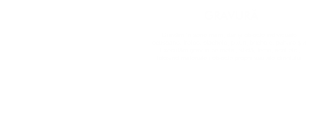 Vă oferim servicii de imprimare textile, personalizare, gravura, printare color, print de mari dimensiuni, concepție grafică, realizare de meniuri și multe altele. De asemenea vă punem la dispoziție cupe, trofee, medalii, plachete, tricouri, și alte obiecte ce se pot personaliza și pot constitui premii, cadouri sau pot da o notă aparte afacerii dumneavoastră.